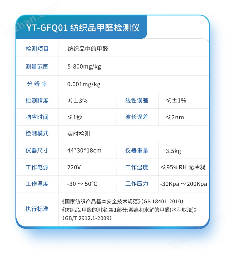 服裝紡織品甲醛含量檢測(cè)儀滿足紡織品甲醛含量檢測(cè)的中國(guó)標(biāo)準(zhǔn)《國(guó)家紡織產(chǎn)品基本安全技術(shù)規(guī)范》(GB 18401-2010)、《紡織品·甲醛的測(cè)定·第1部分:游離和水解的甲醛(水萃取法)》(GB/T 2912.1-2009), 適合各種紡織品、服裝等的甲醛含量檢測(cè)。