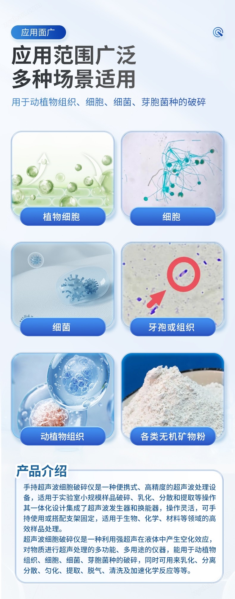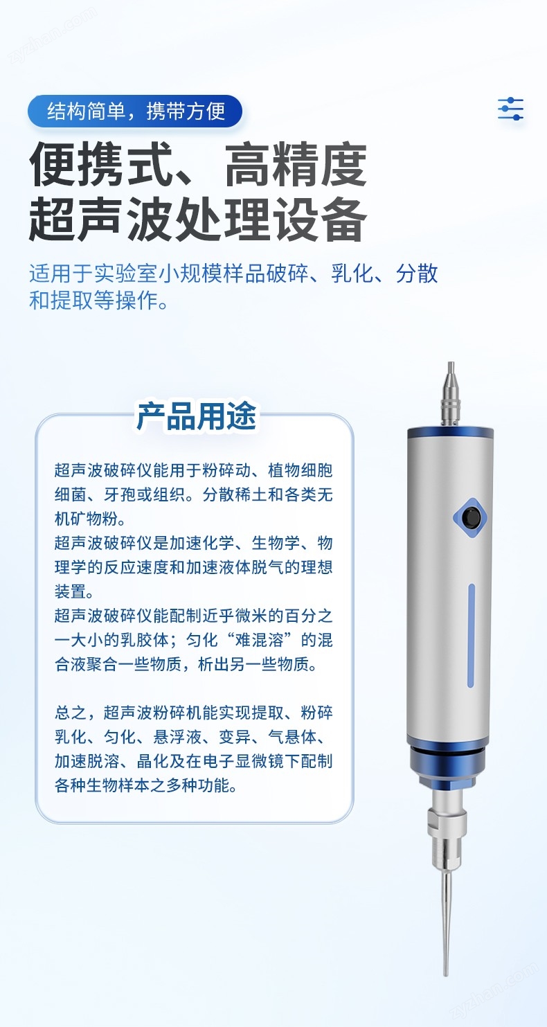 手持式超聲波細(xì)胞破碎儀能用于粉碎動(dòng)、植物細(xì)胞、細(xì)菌、牙孢或組織。分散稀土和各類無機(jī)礦物粉。