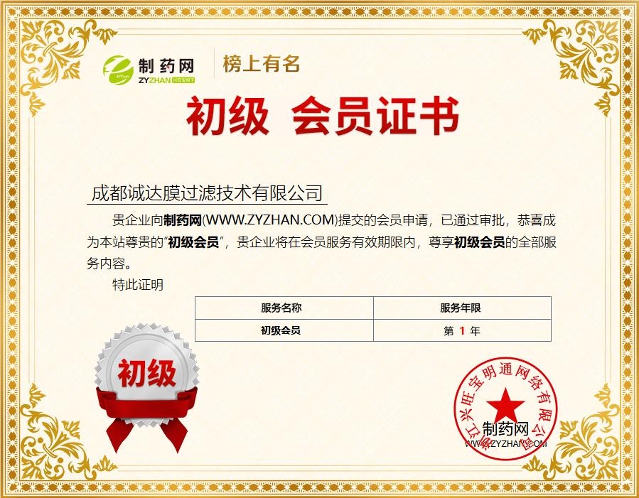 2026年1月13日,成都誠達膜過濾技術(shù)有限公司成功加入制藥網(wǎng),成為制藥網(wǎng)初級會員,并享有該級別會員所享有的服務。