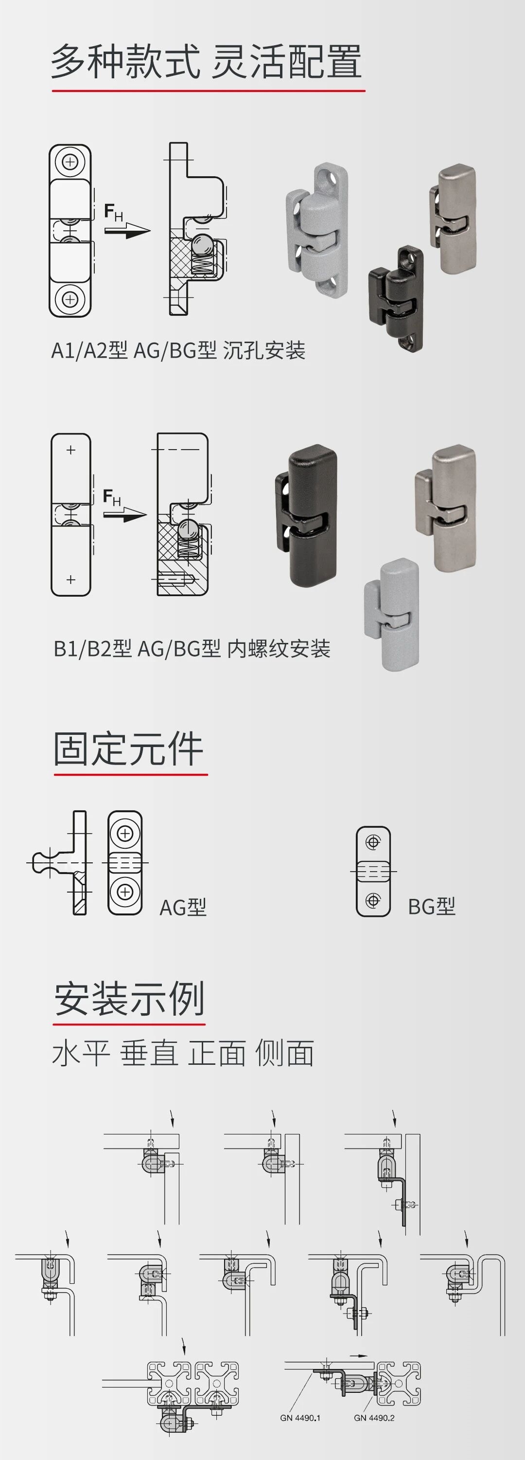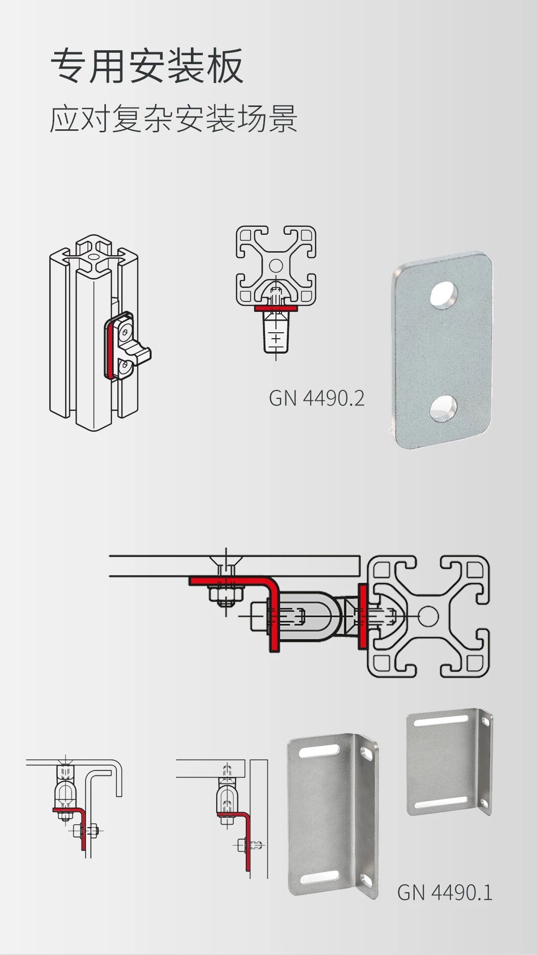 可選配GN 4490.1與GN 4490.2安裝基板,通過長(zhǎng)圓孔靈活調(diào)整安裝位置,搭配鋁型材槽寬專用板,進(jìn)一步提升裝配效率與結(jié)構(gòu)穩(wěn)定性。